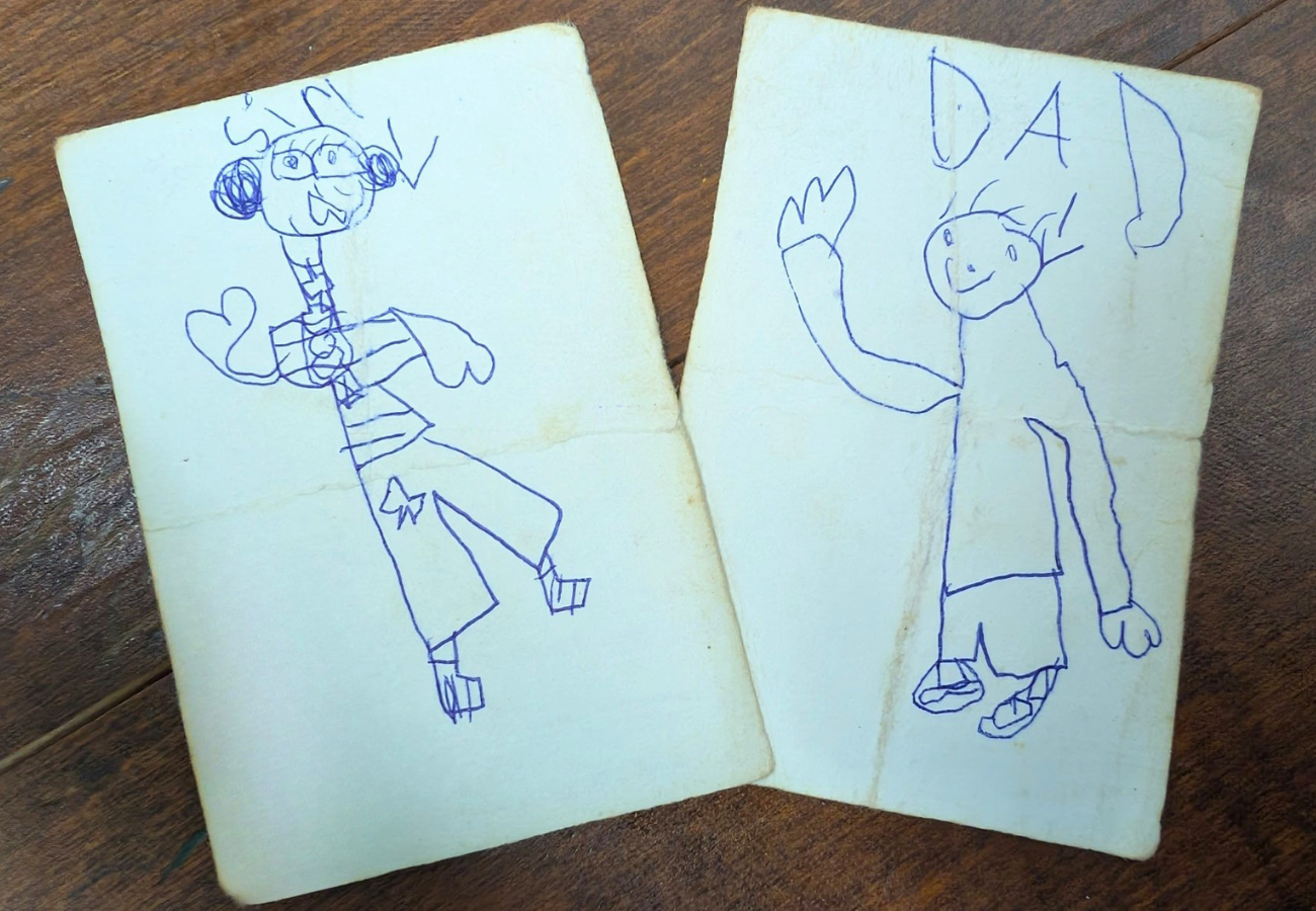 When my second daughter, Siri, was just learning to draw, she gave me two ID cards she had made. They have been in my wallet ever since. They are not great representations of our actual appearance, as you can see, but every so often, when I’m feeling lonely or down, I look at them and usually get teary thinking about her at that age. Perfect ID cards.