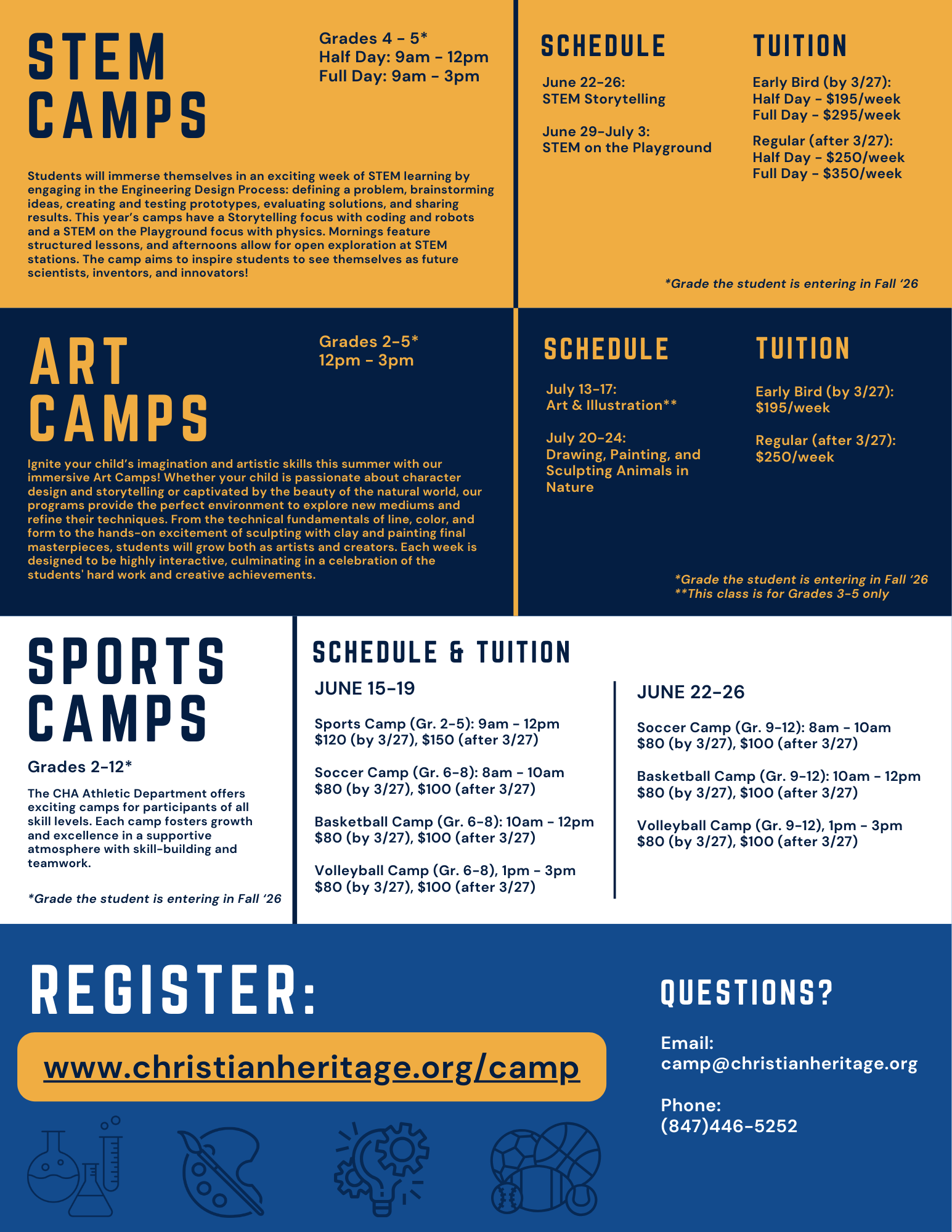 Get ready for CHA's Summer Camps 2026! Check out the variety of camps along with the schedule and rates below. The early bird rates will be good through March 27, but register early so you secure one of the limited spots.